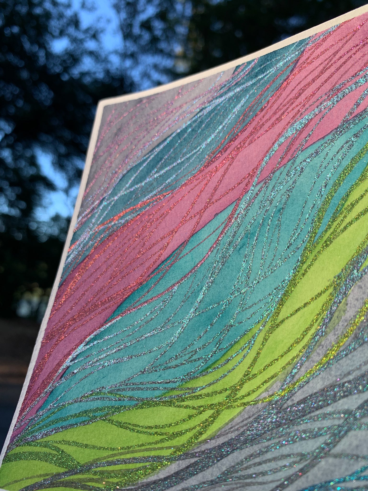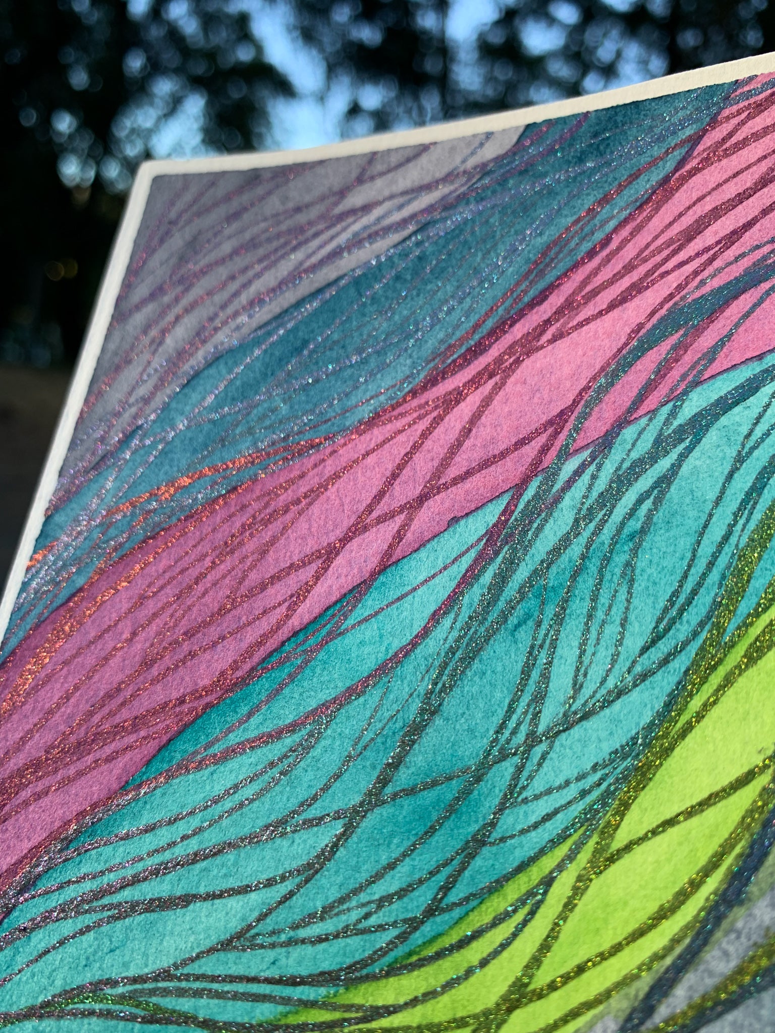 The power of color and calming, intertwining lines come together in this series of colorful, abstract paintings. Created with both traditional and modern, metallic watercolor paint, these abstract paintings remind us that light reflecting at different angles can reveal many facets within a simple line.